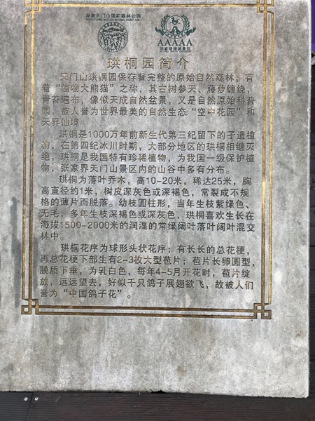珙桐 是一千萬年前新生代第三紀留下的孓遺植物。珙桐 的花是 張家界 的市花。 它會在5月中盛開。 因其花形似鴿子,潔白美麗,又被稱為 鴿子花。