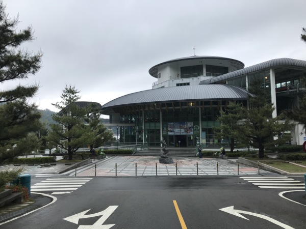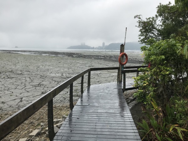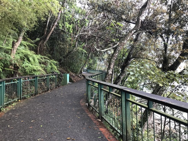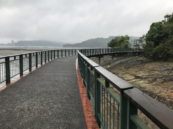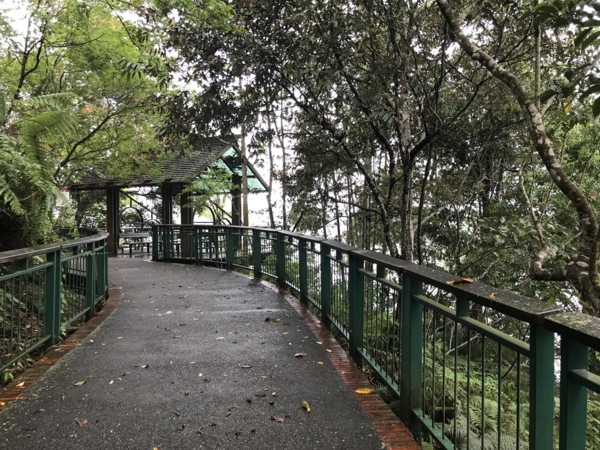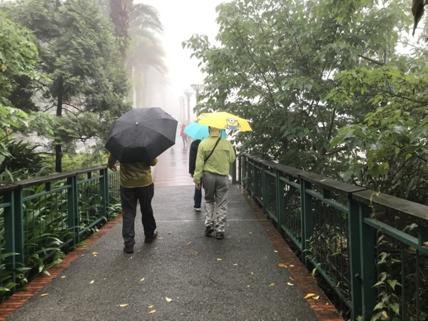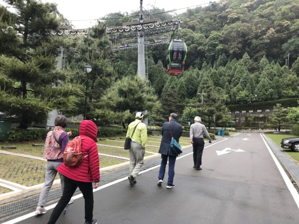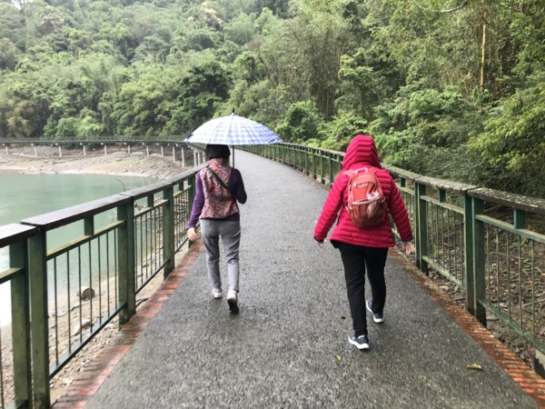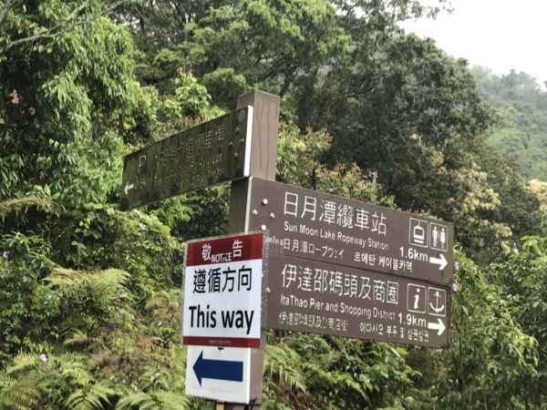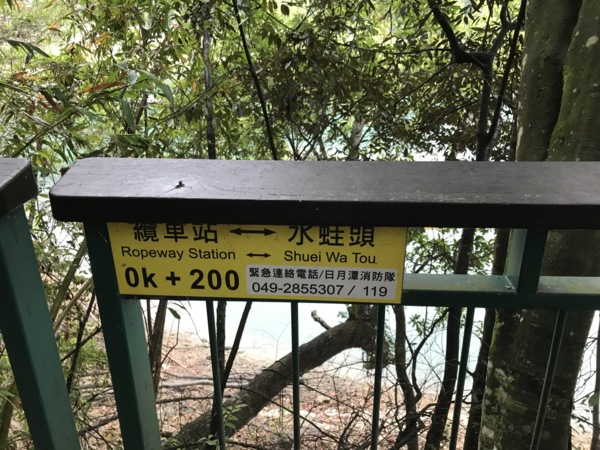 水蛙頭步道 入口處有青蛙雕像和小客車停車場。 這一天下午我們到的時候,已經沒有停車位了。 天空正飄著雨,想到步道有約60公尺的高低落差,恐怕天雨路滑,我們決定繞到 纜車站 那一邊,停好車,再沿著 親水步道 走到 九蛙疊像。這段路平坦好走,還可以邊走邊欣賞 日月潭 的湖光山色。
