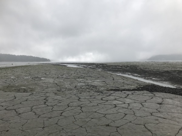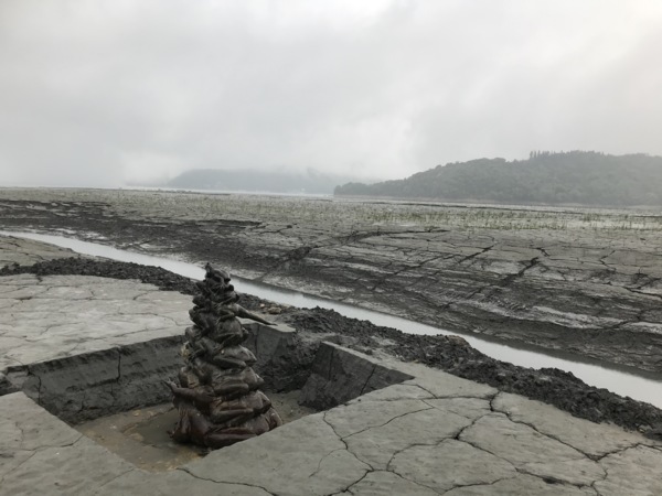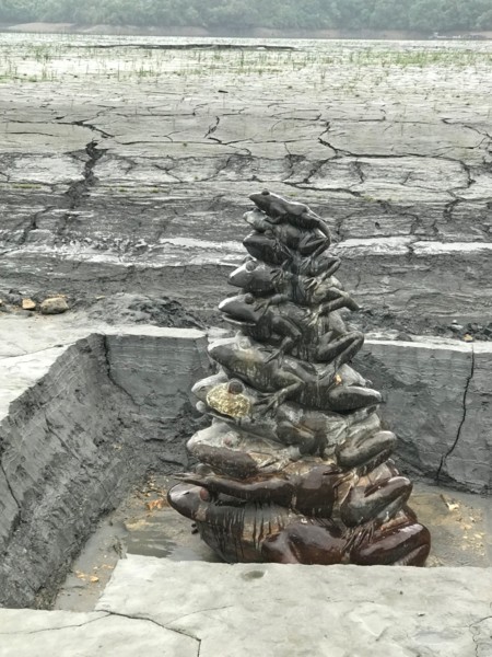 由於上游流下來的泥土淤積,二十來,最下面的兩隻半青蛙一直被埋在土裡面。今年旱象嚴重,日月潭水位不斷下降,日月潭國家風景區管理處 派工人挖開周圍的淤泥,讓埋在土裡面的兩隻半完全出土。