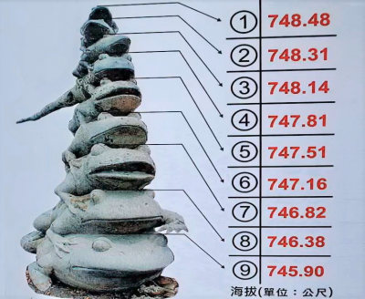 當九隻青蛙都被淹沒時,代表水位超過海拔748.48公尺。而最下方的那隻青蛙的頭頂高度,是海拔745.90公尺,因此當它完全露出來時,水位落差應有3公尺吧? (748.48-745.90=2.58)