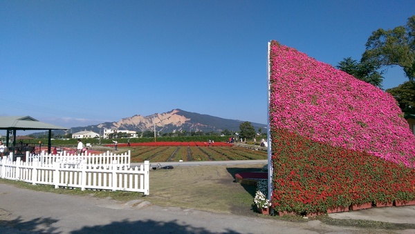 遠處的火焰山與花田融合成一幅美麗的畫面