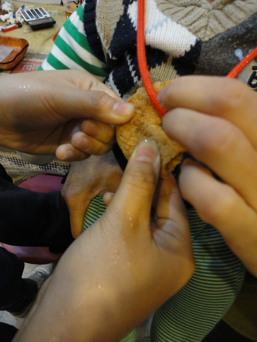 把撥下來的餅乾 在下巴處畫一畫 說