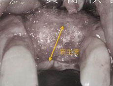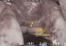 因為長期缺牙,齒槽骨僅剩0.2mm,使用人工骨粉進行補骨手術後,可見長出了厚厚的新生骨, 足以支撐植入的人工牙根。 |