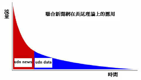 那聯合新聞網可以應用在長尾理論上嗎?當然可以囉,我在白板上長尾理論模式圖上在熱門商品與長尾商品一分為二(如圖),熱門商品代表的是每日最新最熱門的新聞,以倒扁事件為例,圍城與天下圍攻時吸引最多網友注目的眼光,造訪聯合新聞網者眾(udn news),等到該新聞的熱度一過,自然沒有人再注意,網友繼續追逐新的事件,這些新聞也進入聯合知識庫(udn data),一旦日後因為學術研究、學校作業的需要,要再搜尋這些完整的新聞,就必須付費使用。聯合知識庫內的數百萬則文字與圖片就靜靜躺在資料庫中,等待被召喚出來。