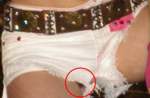 自從上次林志玲在記者會露底褲被狗仔拍到後,不良男本著不服輸的精神,立志要揪出狗仔拍攝穿梆的手法,無意間用圖片編輯軟體開啟記者會拍攝的的照片檔案時,用zoom in的功能時無意間發現下圖,依稀可見底褲,哇!這難道就是狗仔手法的奧秘所在嗎?