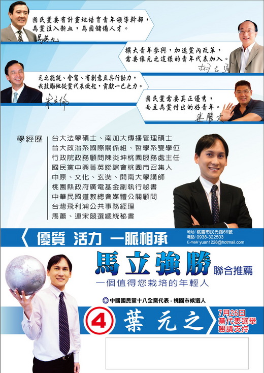 全力支持泛藍軍改革派優秀青年葉元之參選國民黨桃園黨代表