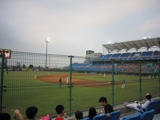好不容易有時間可以進球場看球,第一次進到青埔桃園球場,興高采烈地衝到售票口買票,心裏懷念的是那空曠的左外野(因為右打者通常將球拉至左外野),但買了票才知道桃園球場沒有外野票,雖然有點失望,但進到球場後看到那藍色如海的座椅、和青綠色的球場草皮,激動興奮的心情稍微壓抑住了落寞,找到座位坐下來,好好調整一下心情準備看球。