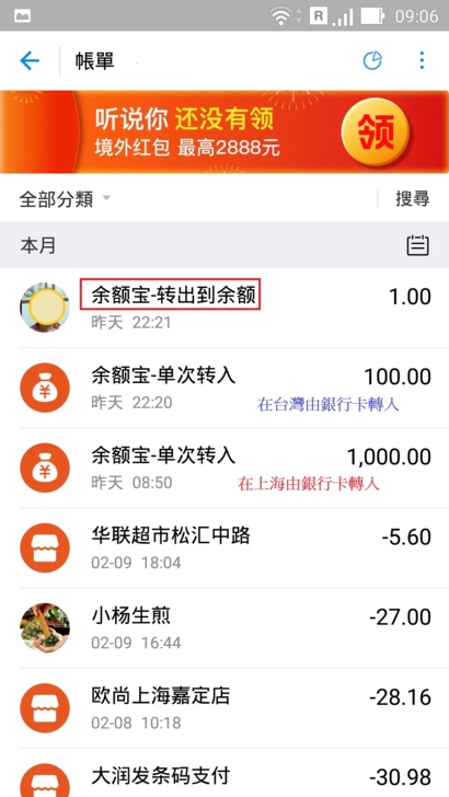 上圖餘額寶帳戶有1099元,交易過程如下圖,昨天早上人在上海旅館時,由綁定的銀行卡轉入1000元到餘額寶。為了測試在中國大陸境外能否使用餘額寶,晚上人在台灣時再轉入100元,最後測試轉帳1元到餘額帳戶。