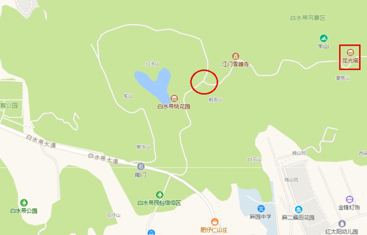 白水帶的景色我認為不算特別,繞著小湖泊走了一圈後,要去地標景點「龍光塔」,在下圖圓圈處走錯方向,結果是環山路走了一圈,龍光塔沒有到訪。