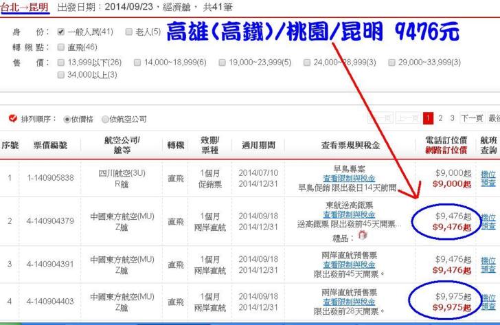 高雄直飛昆明,月票來回13133元,稅金約2600元,如下圖。