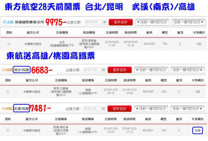 東方航空有高雄直飛南京及武漢航班,因此有由桃園飛成都,南京或武漢飛回高雄的組合了,如下圖。
