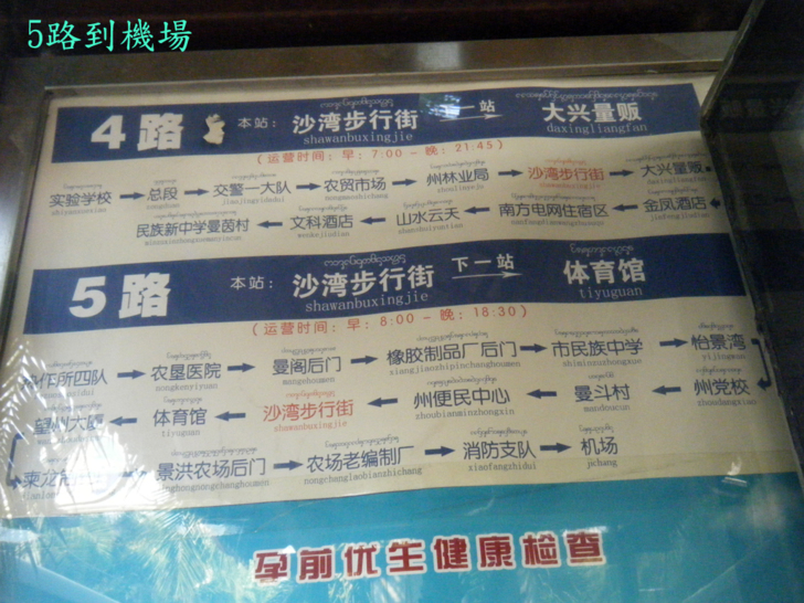 前天2月18日已經看過景洪5路公車終點站是機場,第一班08:00發車,如下圖站牌圖看起來還很新。2月20日天微亮就退房,07:58步行抵達沙灣步行街站,依常理第一班公車會於08:10至08:15間現身,結果等到09:15都無蹤影,最後花了30元搭計程車,去不到5公里距離的機場,離開景洪前,被宰了一次!!