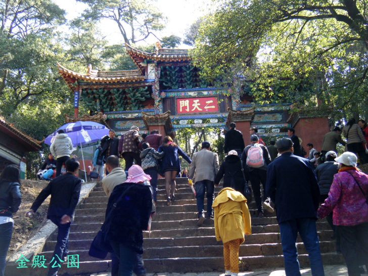 金殿公園門票30元,網路購票24元,打8折還不錯,結果出園時看見節日優惠價25元!要上金殿,要爬一段階梯,雖然不算長,但昆明海拔約1950公尺,剛起步時還是有點費力的感覺,但慢慢走還不至於會喘!下圖是拍二天門時不小心入鏡的,人家腳踩高跟鞋都能上金殿,穿運動鞋或休閒鞋的人沒資格喊累!