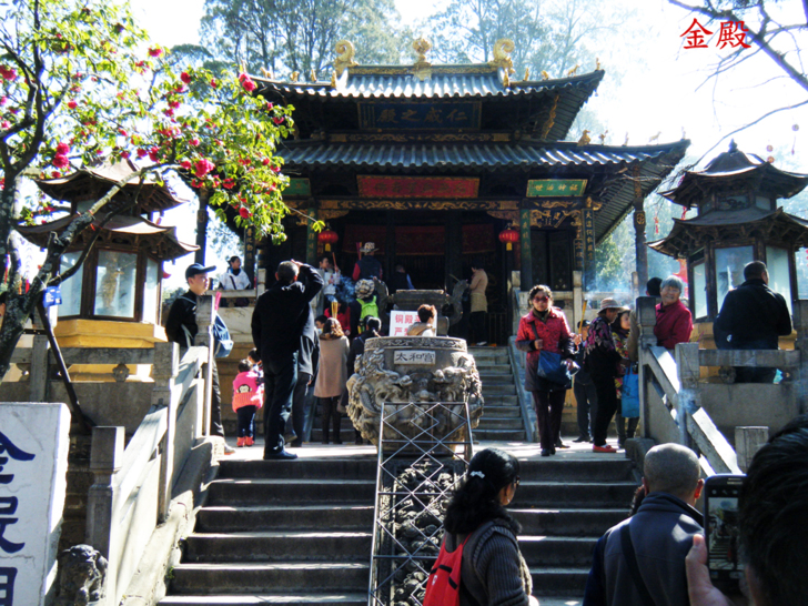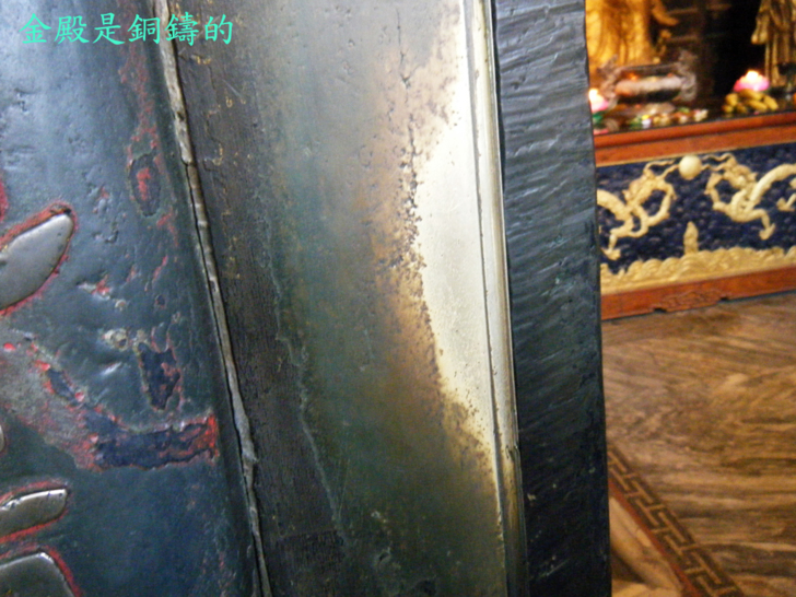 金殿就是一座銅鑄的殿堂,昆明金殿看起來比武當山的小一號,但下圖可看出的確是黃銅材質的,被遊客摸得發亮的部份。老婆手敲柱子時,旁邊阿伯不屑的說「不用敲,不是銅的怎麼叫金殿?」