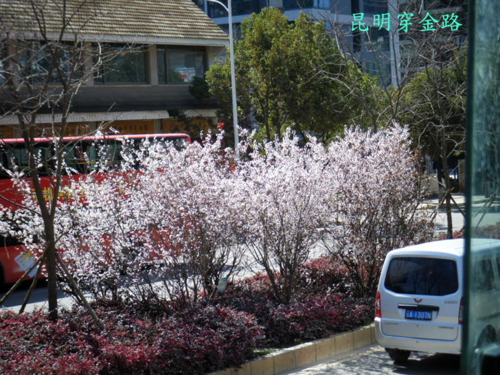 10路公車坐了10多公里才1元,從第一站坐到終點站。想起昨天13元的919路公車就有點氣!雙層公車上層視野佳,加上開得比較慢,是市區觀光的好位子。今天運氣不錯,穿金路沿途開滿著花,如下圖,我們兩人討論後,認為是梅花?