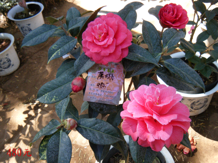原本山上就有不少茶花樹,但沒有為了茶花展廠商贊助的盆景開的漂亮,仔細看,盆景都有標價,下圖480元一盆算是一般行情,比較大盆的要2千多元。