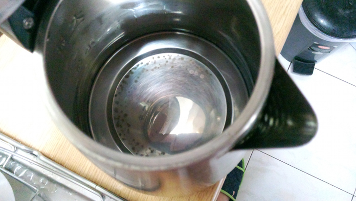 換濾芯的同時,順便清洗一下壺底,光用刷子,壺底水垢結晶很難刷掉,約一碗水份量加一些醋,燒開後刷子刷兩下,壺底水垢就不見了,如下圖。