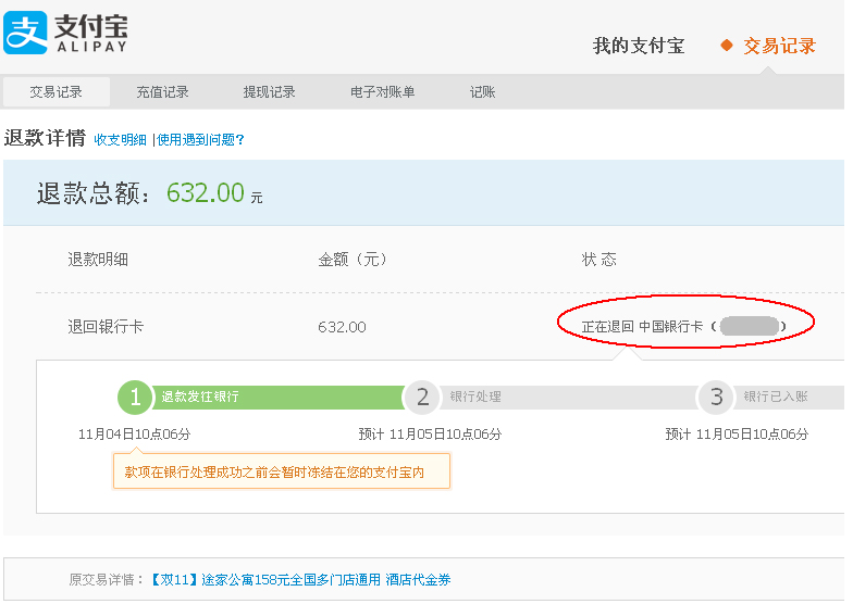 以上退款不是退至「支付寶」帳戶,而是「退款至銀行卡」?第一筆詳細資料如下圖,退款至中國銀行。
