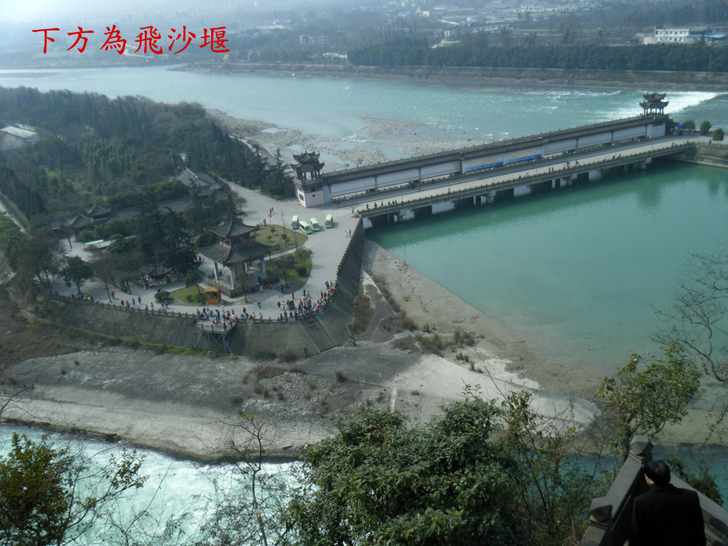 鬥犀台往下看,可看見之前經過的道路及「飛沙堰」,飛沙堰到魚嘴有一段路,旅遊團趕時間,都搭在橋頭等候的景區車過去。