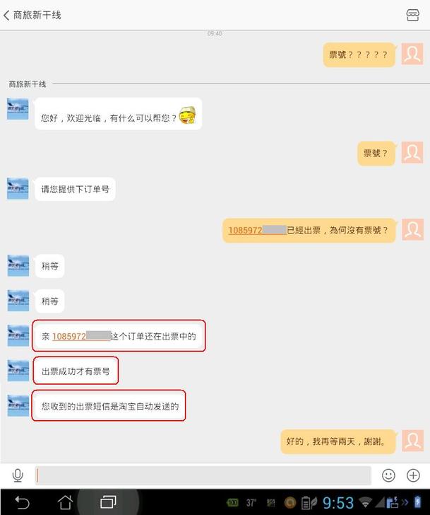 「成功出票,為什麼票號要再諮詢賣家」?以前訂機票,出票時就會有票號,這次不一樣。隔天早上,上淘寶問了賣家,對話如下圖。