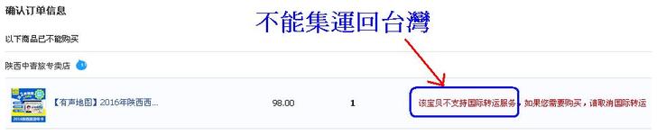 送出結帳,配角沒問題,反倒是主角過不了關?如下圖,「該寶貝不支援國際轉運服務」。再試了七八家,情況一樣!