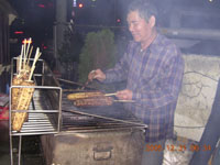 去了布袋漁港買了十六斤的魚丸. 吃了一個蚵仔超多的蚵仔煎. 然後由雅欣繼續帶我吃美食. 文化路的鴨肉羹和潤餅. 不是我在說. 南部的東西真的比較好吃. 又便宜. 又到地. 我還找到渴望已久的傳統式烤玉米. 大家也許對烤玉米不熟. 容我來解說一下. 傳統的烤玉米是由阿伯阿嬸來烤的. 生的玉米直接放上火炭烤, 烤到焦黃後擺著讓客人挑選. 之後上醬. 這樣烤出來的玉米, 焦黑鹹香鮮甜中帶有嚼勁. 可惜呀. 台北現在都是改良式的. 可能是因為傳統的炭火傷眼吧. 改良式的變成了先把玉米煮熟之後再上醬的時候稍微烤一下.雖省時, 也省掉了烤玉米那獨特的香味. 還好. 我在嘉義又找到它了. 附帶一提, 同樣大小的玉米, 台北賣一百塊錢. 這裡只賣四十五塊. 知道我為何愛南部了吧.