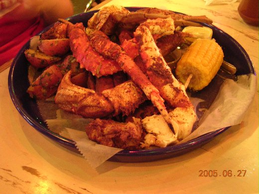 晚餐: 旅館對面據說對螃蟹料理有研究的美式餐廳. 點了螃蟹, 三種蟹腳裹一種叫做alBay的粉下去烤. 鹹! 還有三十三隻蝦子, 我們家老闆一個人全部吞了下去. 點心: 又吃了一球Cold stone的冰淇淋. 我現在變成Cold stone迷, 有沒有人要投資在加拿大開一間?