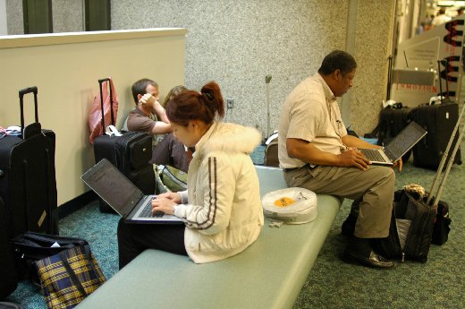 我開電腦的同時, 我們老闆發表了這樣的感想."阿, 以後沒錢就來住機場, 有免費網路可以用. 有東西可以吃. 沒錢了就去幫人家推車一台賺二十五元美分." 我看他自從看了Tom Hanks演的機場情緣後, 就一直羨慕那樣的生活到現在.