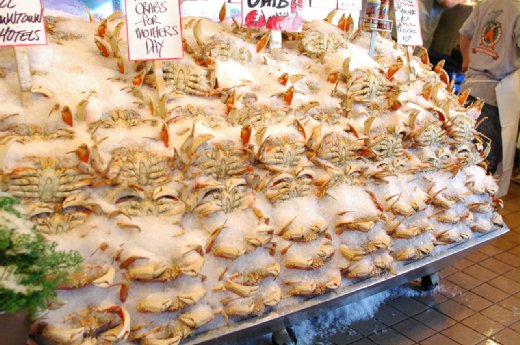 於是從右邊走的第一站,先去看那個上金氏世界的魚店.這魚店的特色就是在裡面工作的全部都是二十幾歲的年輕帥哥.每次有人一買魚,他們開始唱歌.然後最厲害的就是店頭幫忙選魚的人,會遠遠的把魚丟到店後面包魚算錢的人.他們能上世界紀錄的原因是他們曾經一分鐘之內丟了六十多條魚而沒漏接.所以呢,魚店的門口圍了一圈照相機和攝影機都準備好的觀光客.大家一起跟魚店工作人員等待來買魚的客人.那英雄客人,會從人群中走向前,挑魚,然後在歡呼中,那魚就被丟向付錢的地方,又在歡呼中,那英雄付了錢.掌聲中買魚,歌聲中抱魚回家,多開心.