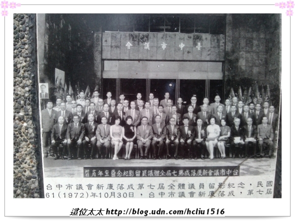 首屆台中參議會在台中州(今台中市政府)前合影。在現政體制內並未聽過參議會,查了維基的描述才知非常短暫的體制,1950年的合影,1951年就廢止。當時台中縣當選者為林獻堂、洪火煉、楊陶、丁瑞彬。