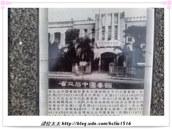 這張照片位於自由路館舍的台中圖書館的建築造型與查到另一資料建築差異甚大(註),故不知是否為同一時期的建築?還是有時代的差距?待查證