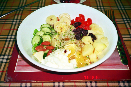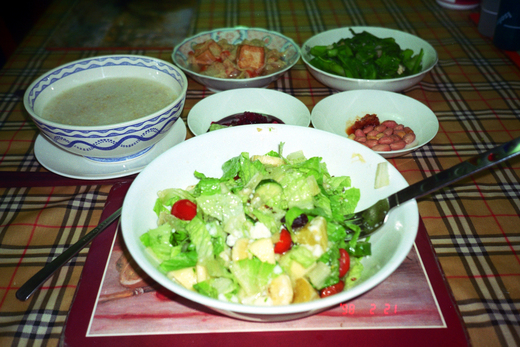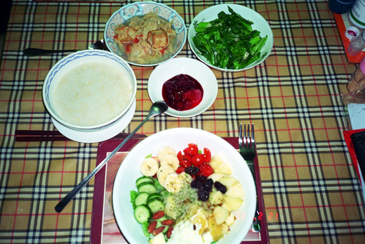 早 上 起 來 , 漱 洗 完 畢 , 先 喝 兩 杯 溫 熱 開 水 , 約 500 c c ~ 600 c c , 可 以 感 覺 熱 開 水 從 胃 部 流 進 腸 道 , 經 過 一 個 晚 上 的 睡 眠 , 人 體 其 實 流 了 不 少 汗 , 只 是 我 們 不 覺 得 , 早 上 起 來 補 充 水 分 , 是 重 要 的 一 件 事 , 一 天 的 活 動 就 此 展 開 . 出 去 走 路 , 散 步 , 運 動 至 少 半 小 時 , 呼 吸 到 新 鮮 的 空 氣 , 頭 腦 清 醒 , 元 氣 充 沛 , 就 可 以 開 始 吃 早 餐 了 . 我 的 早 餐 仍 是 中 國 人 傳 統 的 稀 飯 , 只 是 稍 加 改 良 , 用 糙 米 煮 稀 飯 , 加 入 桂 格 大 燕 麥 片 , 即 成 一 鍋 香 濃 的 麥 片 粥 , 因 為 我 認 為 , 中 國 人 幾 千 年 早 餐 吃 稀 飯 的 傳 統 , 是 有 其 道 理 的 , 第 一 早 上 可 以 補 充 水 分 , 第 二 胃 腸 經 過 一 晚 的 休 息 , 消 化 力 較 弱 , 還 不 能 一 下 子 吃 太 重 的 口 味 , 以 清 淡 為 宜 . 所 以 早 餐 的 配 菜 就 以 清 淡 素 食 為 主 , 一 大 碗 生 菜 沙 拉 , 一 盤 炒 青 菜 , 一 盤 雪 菜 毛 豆 或 酸 菜 麵 筋 , 甚 至 豆 腐 加 醬 油 即 可 . 另 外 還 有 一 碟 冷 凍 的 新 鮮 莓 果 . 這 就 是 我 的 健 康 早 餐 , 看 似 簡 單 , 其 實 內 容 豐 富 , 生 菜 沙 拉 包 含 11 種 蔬 果 : 1. 卷 心 萵 苣 或 蘿 蔓 2. 小 黃 瓜 3. 小 蕃 茄 4. 洋 蔥 5. 甜 椒 6. 蘋 果 7. 柳 丁 8. 香 蕉 9. 苜 蓿 芽 10. 優 格 11. 杏 仁 堅 果 . 再 加 適 量 的 柚 子 醋 或 蘋 果 醋 或 紅 酒 醋 , 一 點 蜂 蜜 , 稍 拌 即 成 一 碗 美 味 的 生 菜 沙 拉 . 炒 青 菜 則 是 每 天 輪 流 不 同 的 青 菜 一 盤 : 空 心 菜 , 格 蘭 菜 , 油 菜 , 菠 菜 , 小 芥 菜 , 高 麗 菜 等 . 另 外 的 雪 菜 毛 豆 , 酸 菜 麵 筋 可 預 先 炒 好 , 早 上 取 出 適 量 , 溫 熱 即 可 . 至 於 冷 凍 新 鮮 莓 果 含 有 三 種 : 覆 盆 子 , 藍 莓 和 蔓 越 莓 , 這 些 都 是 抗 氧 化 的 好 食 物 , 如 果 怕 酸 , 可 加 一 點 蜂 蜜 , 這 樣 簡 單 清 淡 而 又 營 養 豐 富 的 早 餐 , 吃 過 後 會 讓 你 神 清 氣 爽 , 有 飽 足 感 卻 又 熱 量 不 高 .