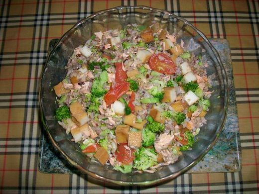 將 煎 好 的 鮭 魚 弄 成 大 碎 片 , 再 將 百 頁 豆 腐 切 成 小 方 丁 , 最 後 將 青 花 椰 菜 切 稍 碎 , 就 可 開 始 拌 飯 了 , 用 十 穀 米 煮 好 的 飯 , 特 別 香 Q , 將 飯 舀 進 一 個 大 玻 璃 盌 中 , 先 拌 勻 鮭 魚 碎 片 , 再 拌 百 頁 豆 腐 丁 , 最 後 倒 進 切 碎 的 青 花 椰 拌 勻 , 就 是 一 道 美 味 , 營 養 , 賣 相 佳 的 鮭 魚 拌 飯 . 這 道 健 康 美 食 , 可 以 取 代 多 油 的 蛋 炒 飯 , 適 合 高 血 脂 的 人 吃 食 , 配 一 碗 簡 單 的 味 噌 豆 腐 湯 , 通 常 , 晚 餐 我 只 吃 一 碗 飯 , 碰 到 鮭 魚 拌 飯 , 我 會 忍 不 住 再 添 第 二 碗 .