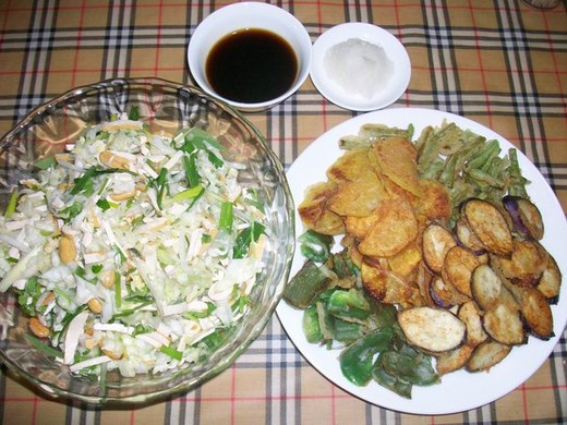 跟 涼 拌 菜 心 搭 配 的 菜 色 , 這 次 我 選 擇 < 炸 蔬 菜 > , 即 日 式 < 天 婦 羅 > , 這 種 組 合 , 有 點 特 別 , 就 算 現 在 流 行 的 複 合 式 < fusion > 吃 法 吧 ! 炸 蔬 菜 的 材 料 , 我 喜 歡 這 四 種 : 1. 四 季 豆 2. 大 青 椒 3. 茄 子 4. 地 瓜 , 這 些 蔬 菜 切 好 , 裹 上 薄 薄 一 層 麵 衣 , 就 可 下 鍋 炸 成 酥 黃 香 脆 的 原 味 蔬 菜 , 配 上 一 碗 用 淡 色 醬 油 和 蘿 蔔 泥 混 合 的 蘸 料 , 吃 時 , 將 炸 物 沾 上 這 種 醬 汁 , 蔬 菜 的 清 香 完 全 給 顯 出 , 這 四 種 蔬 菜 , 每 種 份 量 不 必 太 多 , 各 取 少 量 , 炸 出 來 就 是 滿 滿 一 大 盤 , 不 但 視 覺 漂 亮 , 吃 也 好 吃 , 比 起 在 餐 廳 , 一 份 只 有 2 片 地 瓜 , 1 片 茄 子 , 4 根 四 季 豆 - - - - - 等 等 , 實 在 便 宜 太 多 了 , 這 兩 道 菜 和 一 碗 青 菜 豆 腐 湯 , 配 飯 吃 也 算 絕 配 了 !