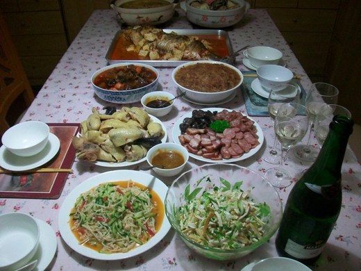 面 對 整 桌 的 年 菜 , 一 種 平 靜 溫 馨 的 感 覺 又 回 復 了 , 遙 想 母 親 當 年 , 從 我 們 小 時 , 不 都 是 年 年 如 此 , 忙 碌 而 歡 欣 的 做 出 整 桌 年 菜 , 比 之 現 在 , 甚 至 更 為 豐 富 , 還 多 了 葷 , 素 什 錦 , 炸 肉 丸 子 --- 等 等 , 現 在 每 年 , 我 必 親 自 下 廚 做 這 些 年 菜 , 乃 是 為 體 驗 母 親 當 年 的 辛 苦 , 這 些 辛 苦 一 直 都 是 由 母 親 一 個 人 承 擔 , 每 念 及 此 , 心 中 只 有 感 念 和 感 恩 . 説 也 奇 怪 , 除 夕 年 菜 全 部 上 桌 後 , 內 心 突 然 平 靜 下 來 , 勞 累 也 消 除 了 , 可 以 向 爸 媽 舉 杯 , 高 聲 説 道 : 祝 你 們 新 年 快 樂 , 請 享 用 孩 兒 所 做 的 年 菜 .