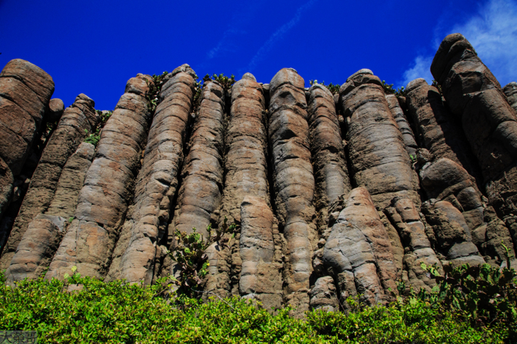 15.柱狀玄武岩之形成係岩漿噴發至地面後,因急速冷卻,體積收縮,導致岩體破裂,形成多邊形之破裂面,並隨著冷卻的進行,發展成多邊形之柱狀體,地質學上稱之為柱狀節理(Columnar Joints)