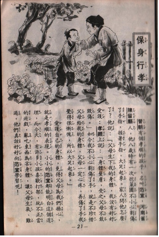 這是一本絕版的一本冊子,是。我小學二年級時適逢學校教孝運動的推行所買的,一本十元,當時幾乎全校師生都有買,不過像我這樣保存了快三十年的可能是找不到了,雖然是很簡陋小本子,沒有現在的書籍印刷的這麼精美,圖文的編排卻很用心,尤其要在簡短的篇幅中將整個孝行的故事用很白話的方式表現出來,是相當不容易的。