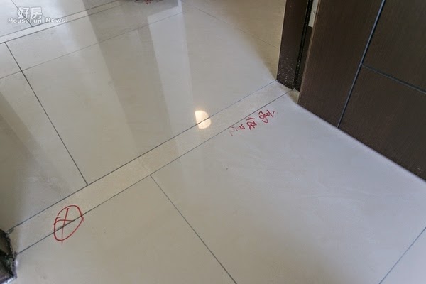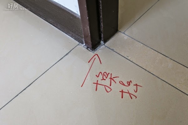 ↓地磚與門框的接合處要特別注意,因為在這個部分地磚為了遷就門框形狀,大都會進行裁切,這時候就要仔細檢查門框與地磚的接縫處是否有確實填實、地磚是否有色差發生。有的話就先標示後拍照,然後要求換掉,完全不用客氣。