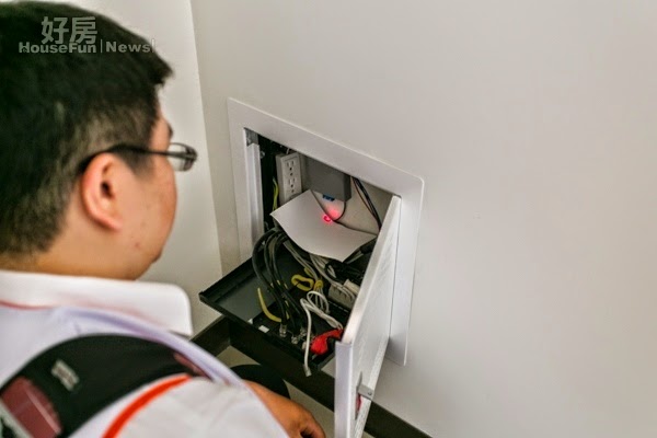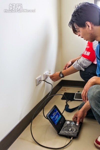 ↓驗屋時不要一個人去,因為可能有很多項目會由不同負責人員同步進行檢驗。在驗屋前可先分派工作,例如A負責全屋的電氣與網路、電話、有線電視訊號是否正常。B負責所有與水相關的檢驗等。遇到問題就請驗屋人員確認,並且自己要拍照。(圖為進行電話線路與有線電視訊號檢驗工作)。
