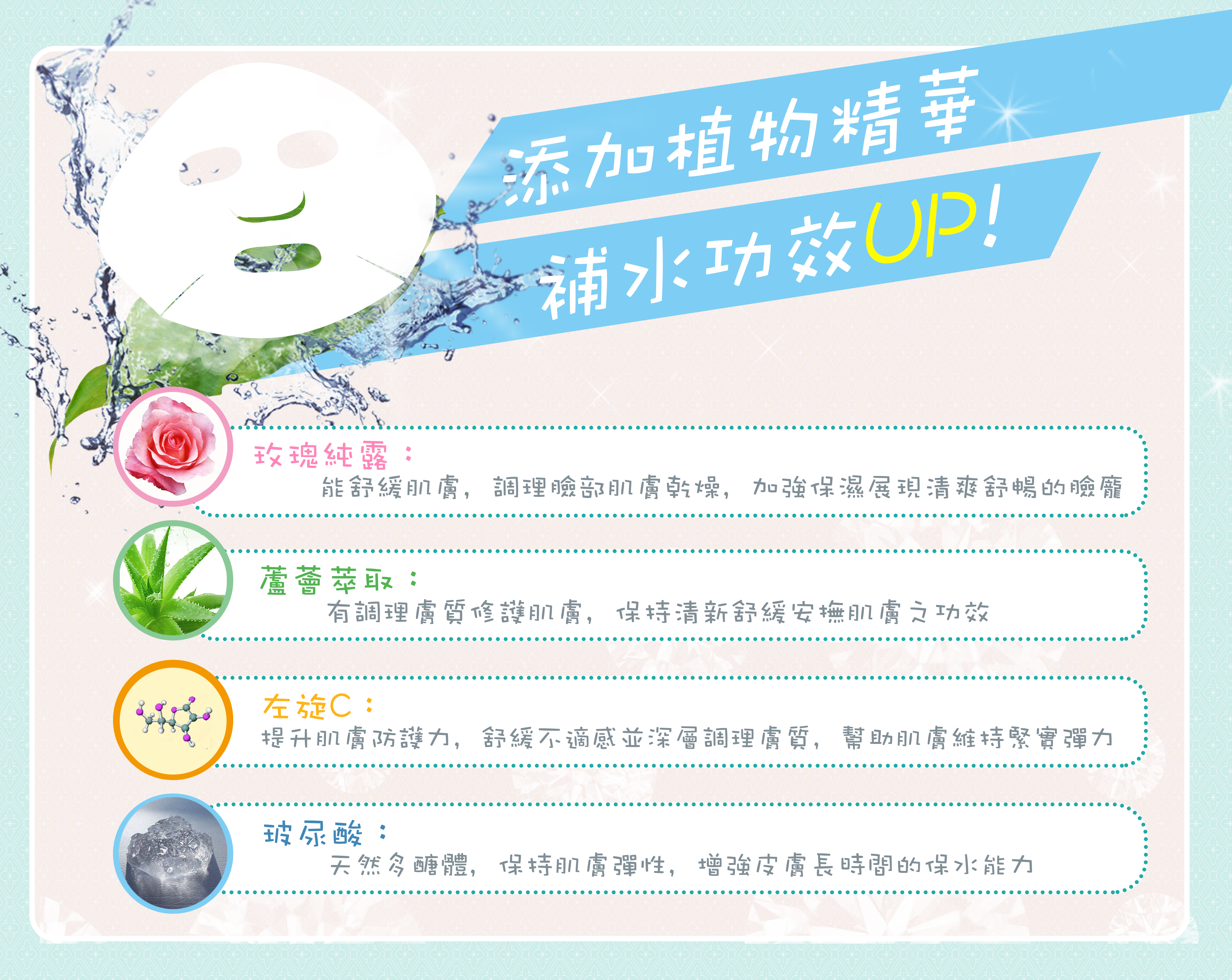 ■ 玻尿酸:天然多醣體,保持肌膚彈性,增強皮膚長時間的保水能力。