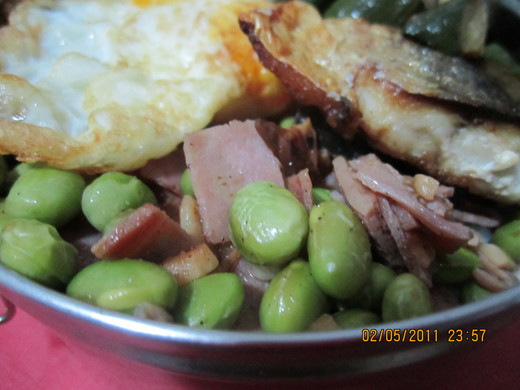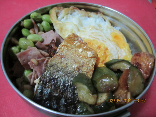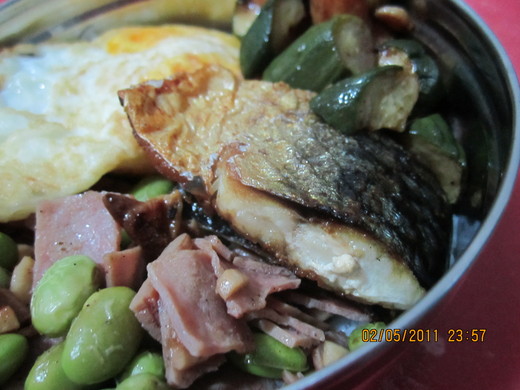 荷包蛋 鯖魚 毛豆炒火腿 小黃瓜炒甜不辣