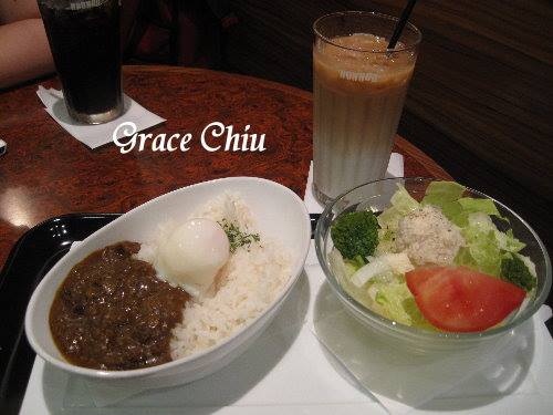 前陣子也有點過11:00後提供的午間套餐中的日式咖哩飯,帶點甜味的咖哩醬味道濃郁,算是重口味的餐點,配上半熟溫泉蛋很可口.