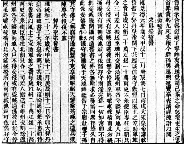 33宋遼交換國書 此為澶淵盟約成立後,雙方之誓書內容。 其中有:「每歲以絹廿萬匹、銀一十萬兩,更不差使臣專往北朝,只令三司差人搬送至雄州交割。」宋真宗誓書與契丹聖宗誓書內容均相同,時在...