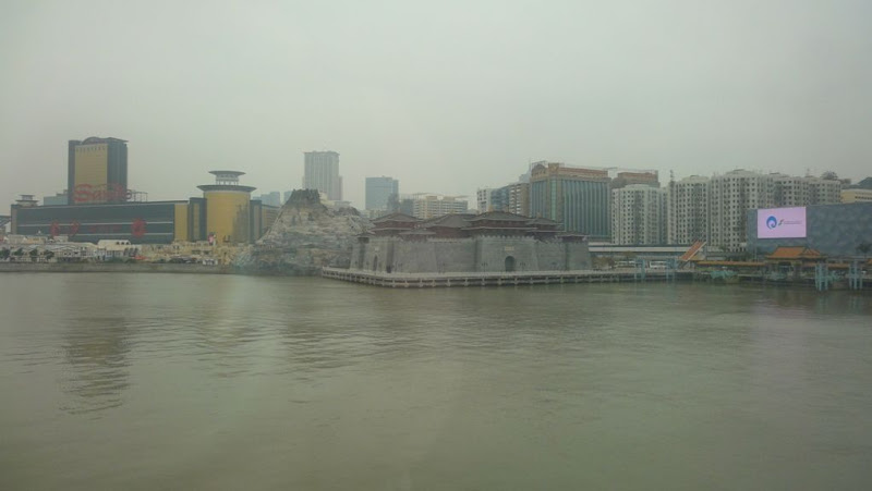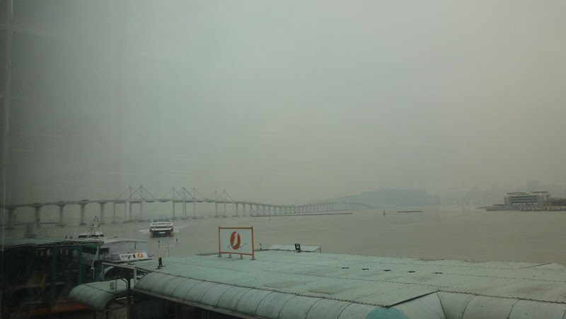 登船還有一點時間,就在碼頭閒逛拍照。一點十分海關出境。但沒有先把離境單準備著,海關要我拿出時,我一時找不出來,後來海關員讓我通過。那一幕是有點抱歉,我走到十三號候船室平靜地等著船班,也拍拍窗外的景觀,望出去可以看到澳乙水大橋,港澳碼頭寬大而新穎,除了香港,還可以到深圳,珠海! 只是這海水就像黃泥一樣渾濁。