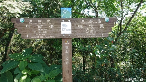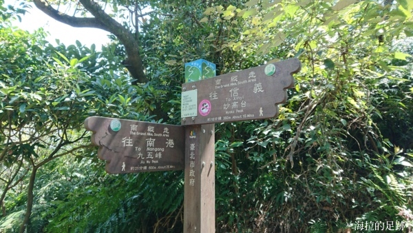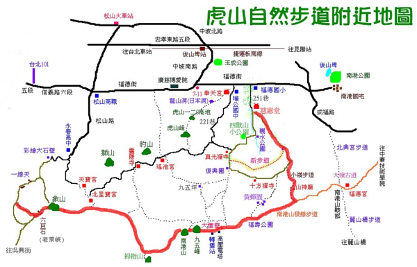 海拉這種肉腳等級當然不可能一天走完全程, 今天的路程預計從虎山自然步道接小嶺步道, 南港山稜線步道, 上九五峯, 路過南港山及妙高台, 最後到象山六巨石, 從靈雲宮下山. (下圖紅色路線)