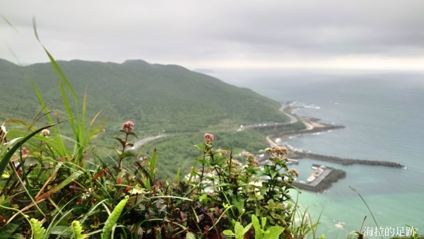 站在老鷹岩的觀景台上可以觀常海天一色的風光, 今天雖然是陰雨天, 但能見度還行. 左下方是大武崙澳底漁港及大武崙白沙灘, 右前方是基隆嶼及野柳海岬.
