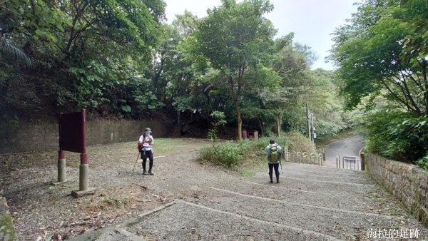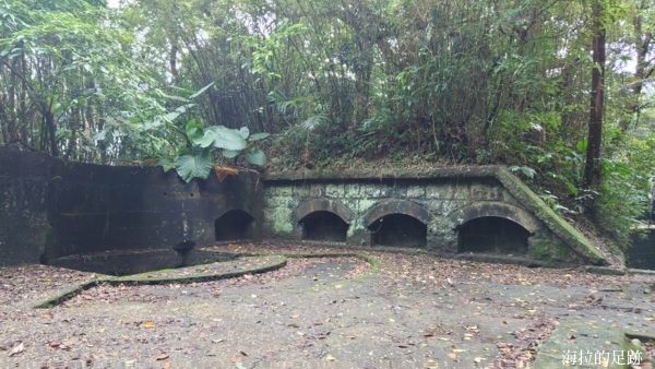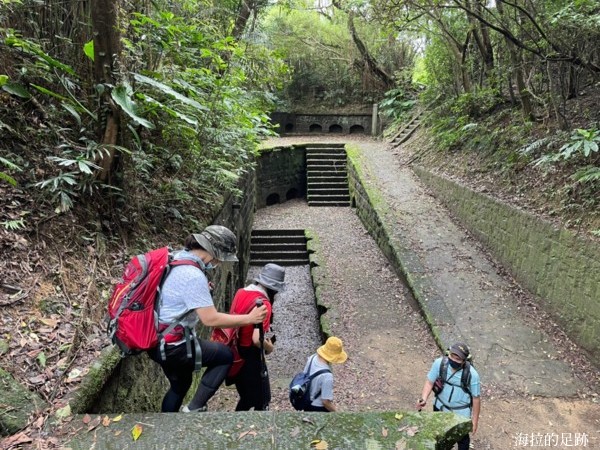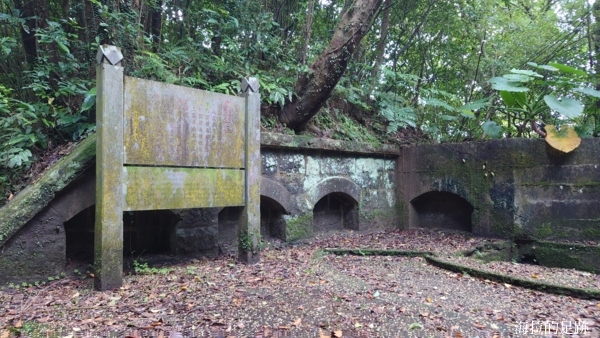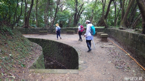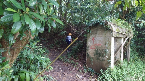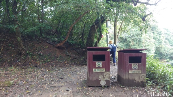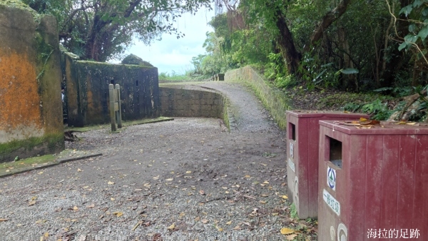 整個砲臺區都逛完了, 外圍也繞了一圈, 但都看不到大武崙山的登山口或三角點, 大家拿出手機, 開始搜尋資料及查看離線地圖. 一直在找網路上說二個垃圾筒後方的登山口在哪裡? 原本以為是上圖這二個垃圾筒前方那條上坡路, 但從那裡走去, 只是繞了砲臺外圍一圈.