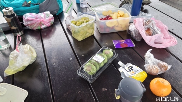海拉爬山的午餐基本上都在便利商店買, 2顆茶葉蛋, 1個地瓜, 有時會再加上水果. 但只要有文琴跟旺哥夫妻同行, 當天一定可以吃飽飽, 他們倆每次都帶好多, 怕大家吃不飽. 感謝他們把海拉餵得飽飽滴~~