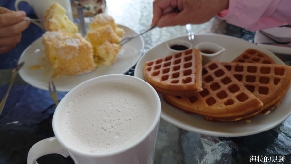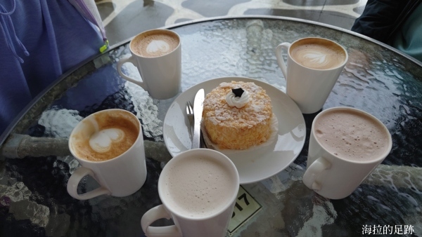 吃完午餐後, 再繼續走情人湖右側的環山步道, 一下子就回到停車場. 老天爺還真是佛心, 等我們走到停車處才開始下大雨. 我們開著車沿著濱海公路, 想要找家咖啡廳坐坐聊聊是非, 沒想到好幾家的門口都停滿了車. 最後, 這家洋朵剛好有人離開, 趕緊地把車停進去.