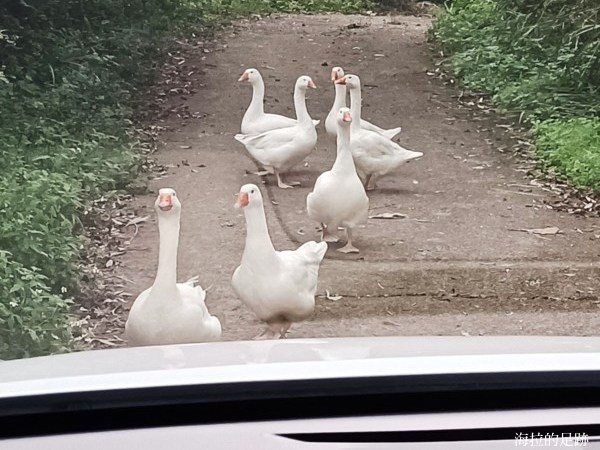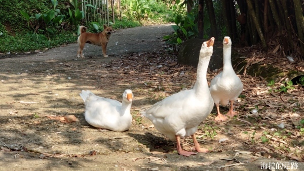 8點半左右, 除了莫達以外, 其他2台車5個人也都相繼抵達鵝公髻山第一登山口, 於是我們八個人先起登. 走在產業道路上沒多久, 遇到一群比狗還凶狠的鵝. 通常海拉很怕在步道或產道上遇到狗, 但今天我們反而先聽到呱呱呱的鵝叫聲, 警示我們不可侵入牠們的地盤.